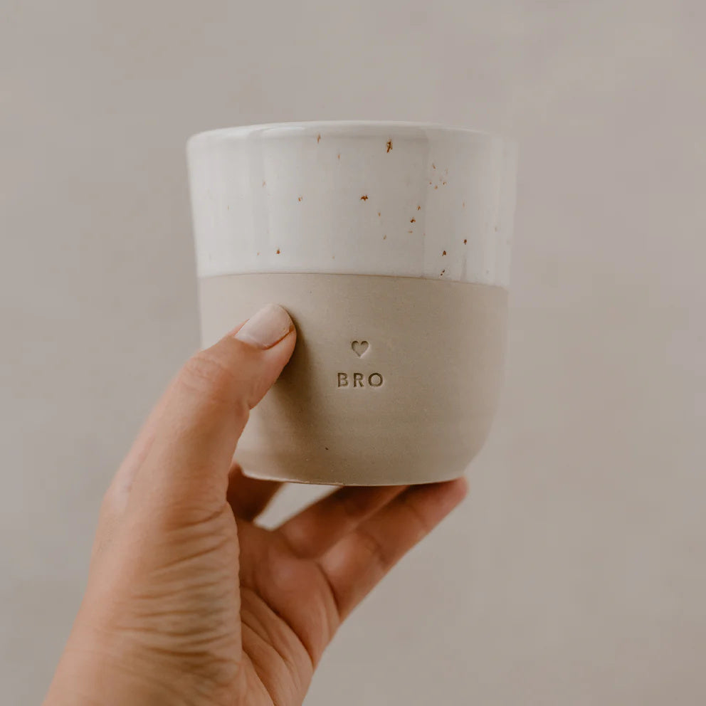 Spülmaschinenfester Becher aus Steingut mit der Prägung "Bro". Eine schöne Geschenkidee für deinen Bruder. Jeder Becher wird in Handarbeit in einer kleinen Töpferei in Portugal hergestellt. Dadurch ist jeder von ihnen individuell. Von Eulenschnitt.