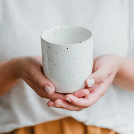 Einfach schlicht und elegant. So kommt der Steingut Becher Calma daher. In Handarbeit in einer kleinen Töpferei in Portugal produziert. Für alle, die die Individualität von Ton und Glasur lieben, denn jeder einzelne Becher hat seinen ganz eigenen Touch.