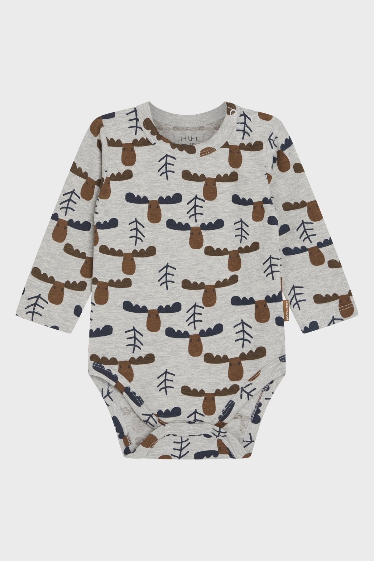 Langarmbody mit einem coolen Elchprint. Der Body ist aus weicher und GOTS zertifizierter Biobaumwolle gefertigt. An der linken Schulter und im Schritt besitzt er Druckknöpfe. Das Logo-Fähnchen von Hust and Claire ist seitlich angebracht. Schön dehnbar durch den Anteil Elasthan.