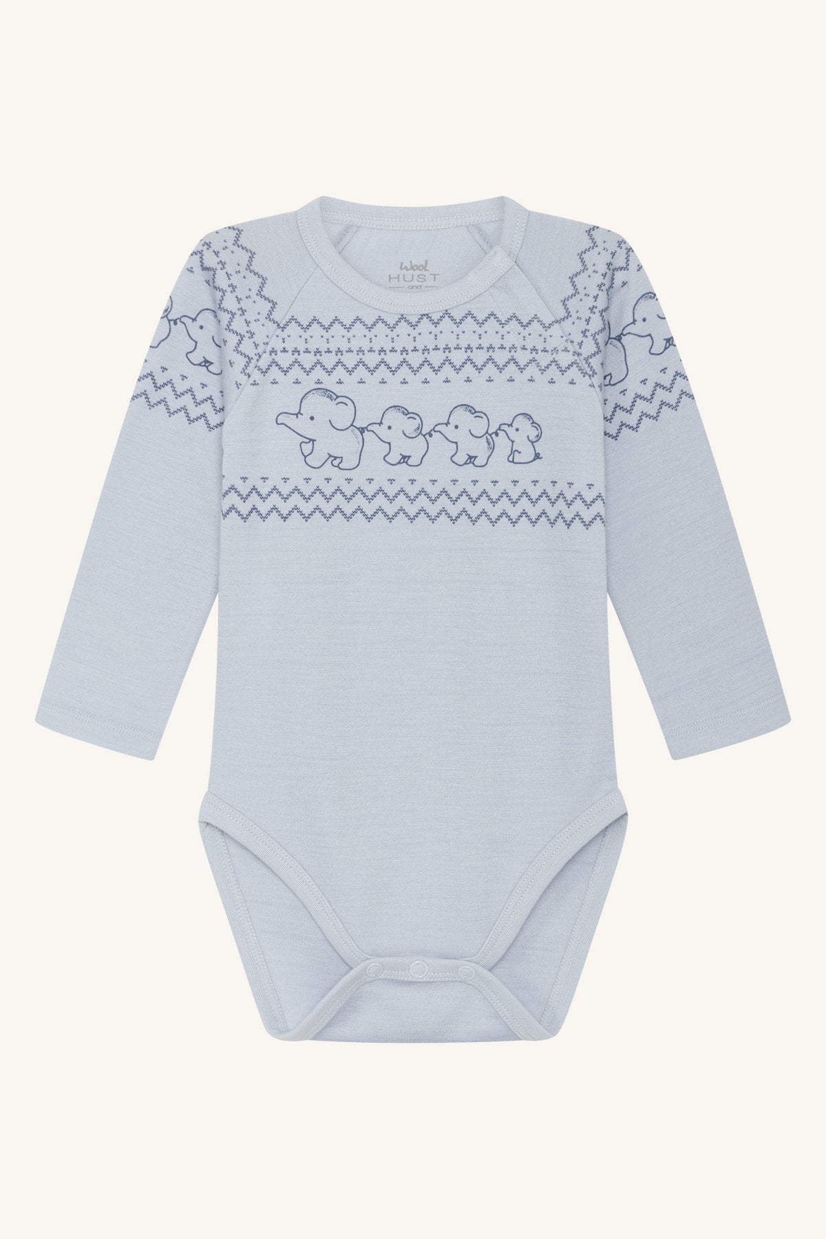 Warmer, dehnbarer Body aus Merinowolle. Regulierendes und hautfreundliches Material. Mit einem schönen grafischen Print und kleinen Elefanten bedruckt. Mit schräg verlaufenden Druckknöpfen an der linken Schulter. Praktische Druckknöpfe im Schritt.