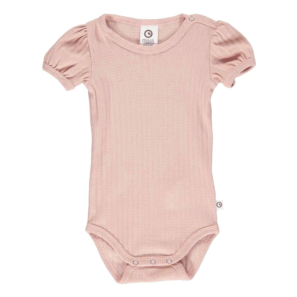 Ein leichter Body mit Lochmuster uns hübschen Puffärmeln. Besonders an heissen Tagen angenehm zu tragen. Mit Druckknöpfen auf der linken Schulter und im Schritt. Aus GOTS zertifizierter Biobaumwolle. Von der dänischen Marke Müsli.