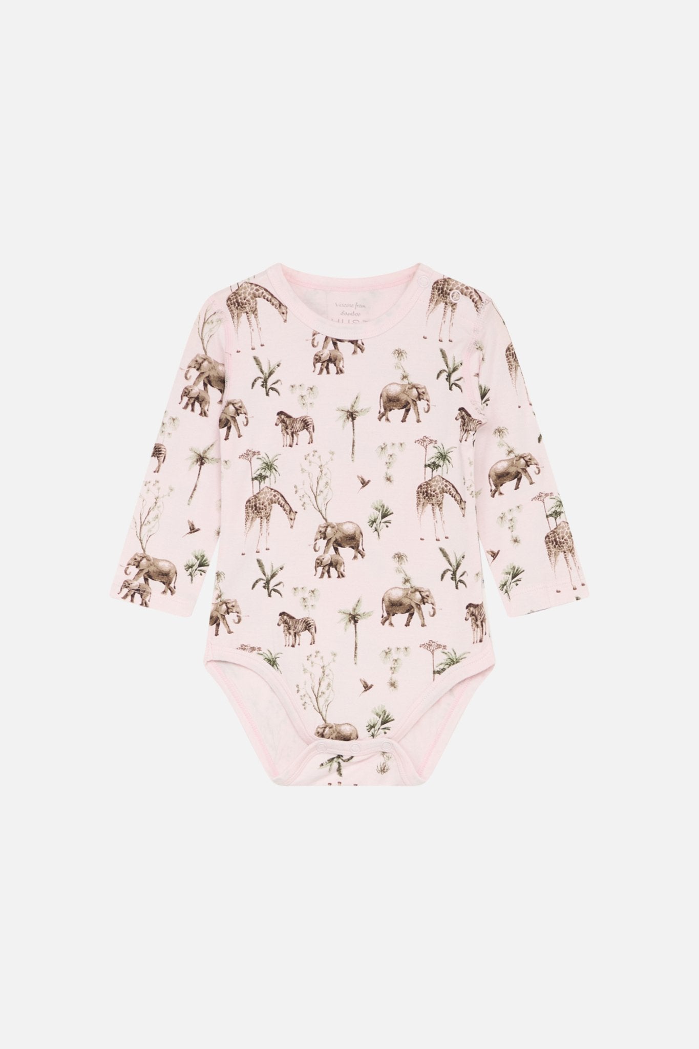 Leichter Langarmbody mit Tierdruck. Aus dem Material Bambusviskose. Perfekt für heisse Tage und empfindliche Haut. Eignet sich sehr gut für Kinder im Tragetuch/Tragehilfe. Mit Druckknöpfen auf der linken Schulter und im Schritt. Lange Ärmel schützen vor der Sonne.