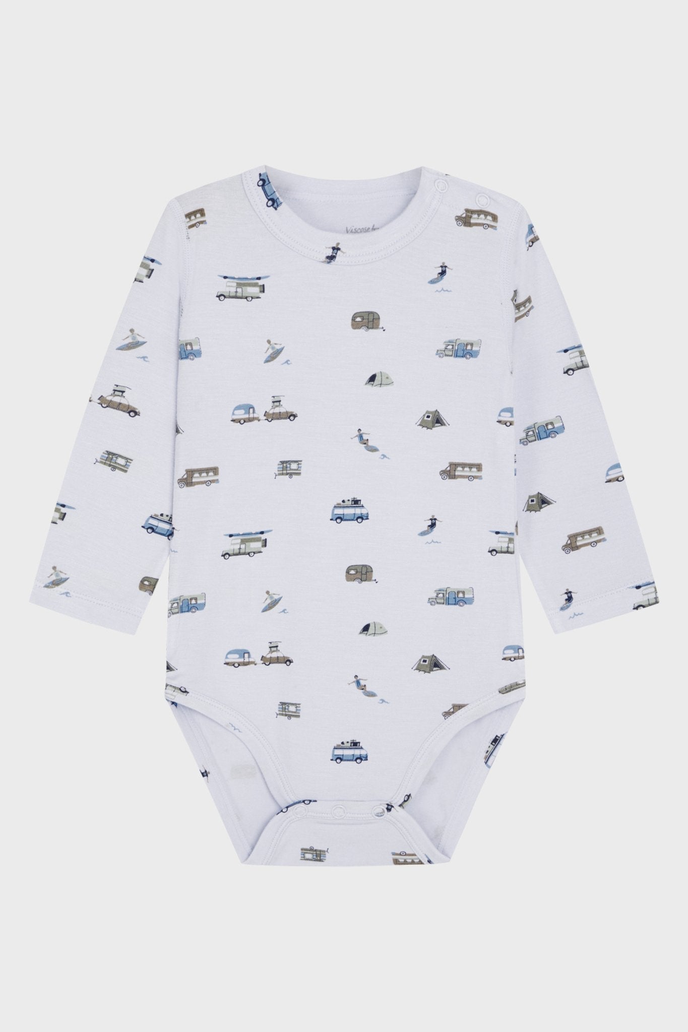 Leichter Langarmbody zum Thema Camping. Aus dem Material Bambusviskose. Perfekt für heisse Tage und empfindliche Haut. Eignet sich sehr gut für Kinder im Tragetuch/Tragehilfe. Mit Druckknöpfen auf der linken Schulter und im Schritt. Lange Ärmel schützen vor der Sonne.