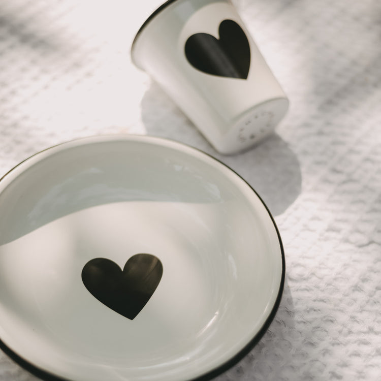 Ob beim Camping, Picknick oder auf Reisen im Van – dieser stilvolle Teller ergänzt dein Geschirr perfekt. Mit einem Durchmesser von ca. 18,7 cm passt er wunderbar auf jeden Tisch und in jeden Schrank. Das schlichte Design mit einem grossen schwarzen Herz macht ihn zudem zu einem echten Hingucker.