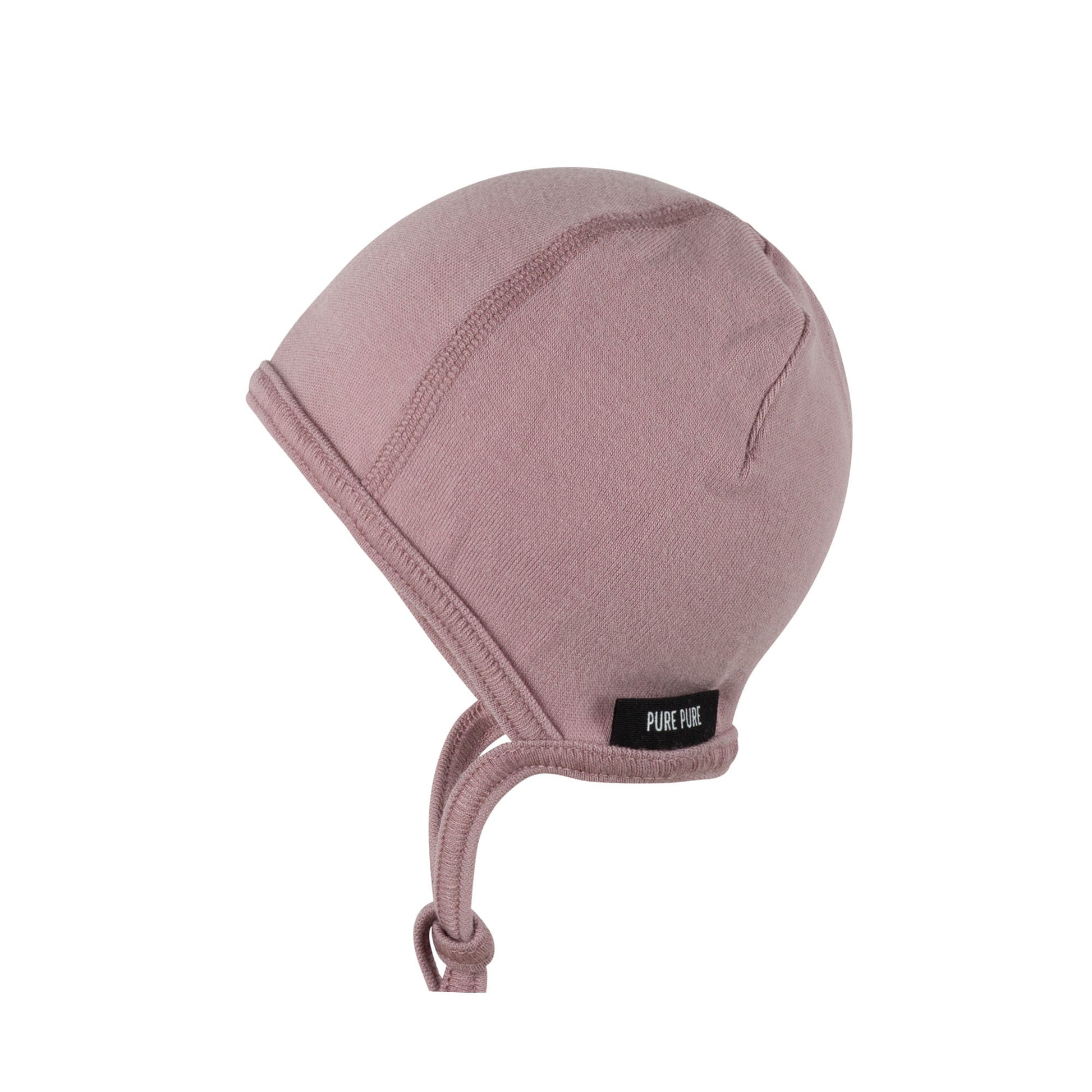 Erstlingsmütze aus GOTS zertifizierter 100 % Merinowolle. Die Mütze ist ganz fein und kratzt nicht. Schmiegt sich dem Babyköpfchen wunderbar an. Das Naturmaterial ist atmungsaktiv und regulierend. Mit Bindeband und angenähtem Logo. Von Pure Pure by Bauer.