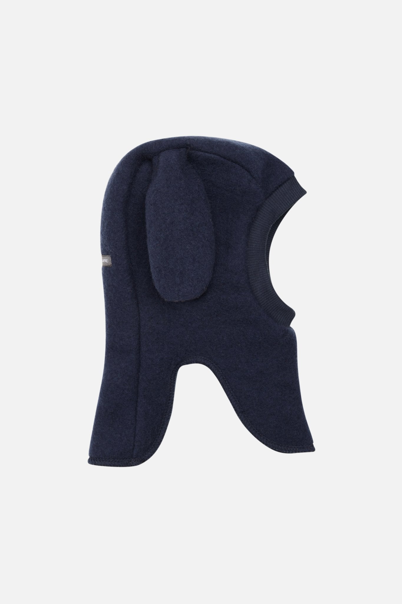 Warme und weiche Schlupfmütze von der dänischen Marke Hust and Claire. Sie ist aus mulesingfreier Merino-Wollfleece und umschliesst das Gesicht wunderbar. An der Gesichtsöffnung befindet sich ein breiter gerippter Rand. Als besonderes Detail hat sie seitlich lange Ohren. Der Hals und Nackenbereich wird dadurch auch gewärmt. Auf der Rückseite befindet sich eine kleine grau Logo-Applikation. Innen ist die Mütze mit feiner Baumwolle abgefüttert.