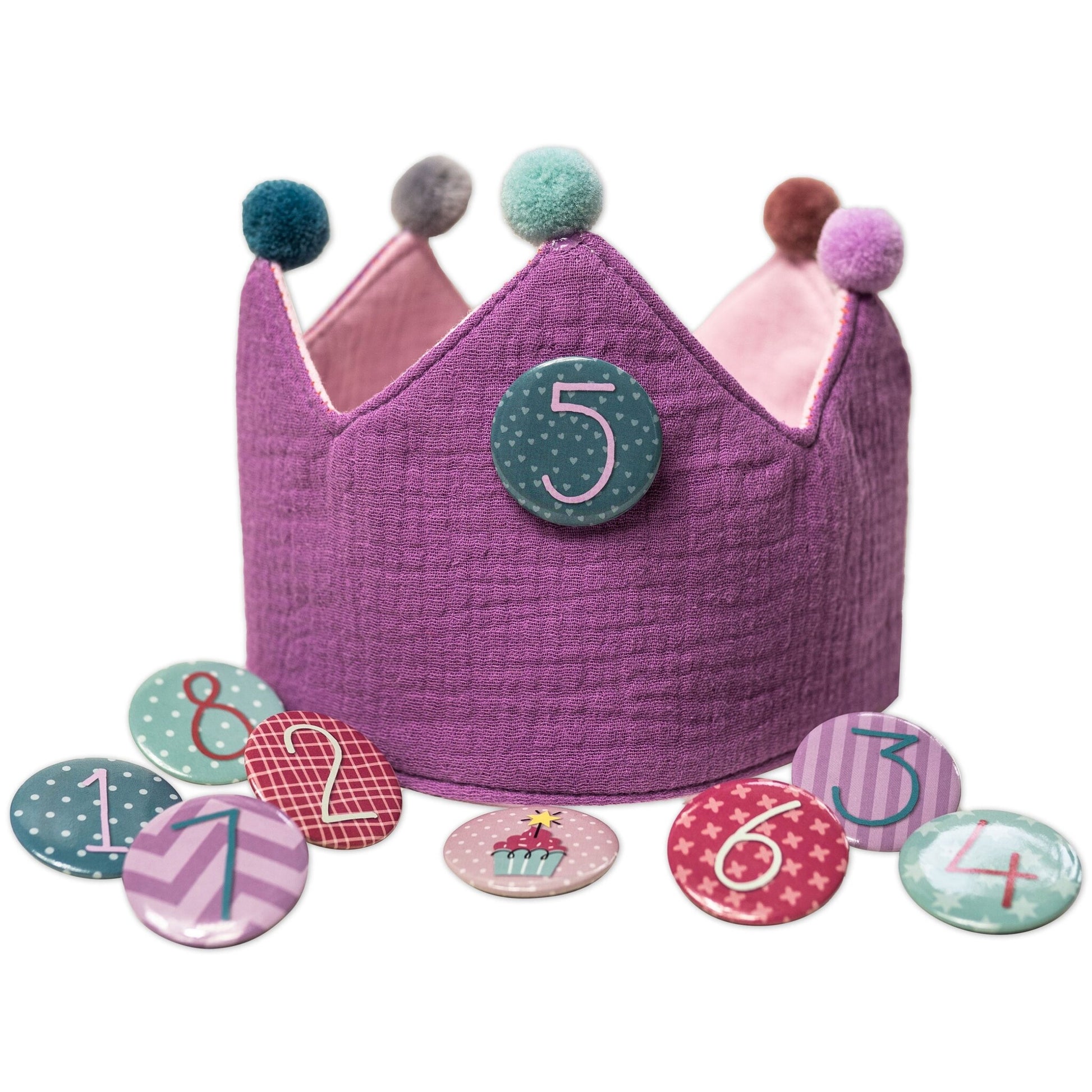- Komplett Set zum Geburtstag: Diese Krone aus Musselin mit niedlichen Bommeln lässt sich jedes Jahr mit der passenden Zahl bestücken – einfach den Button anbringen, fertig! Auch für Geschwisterkinder geeignet