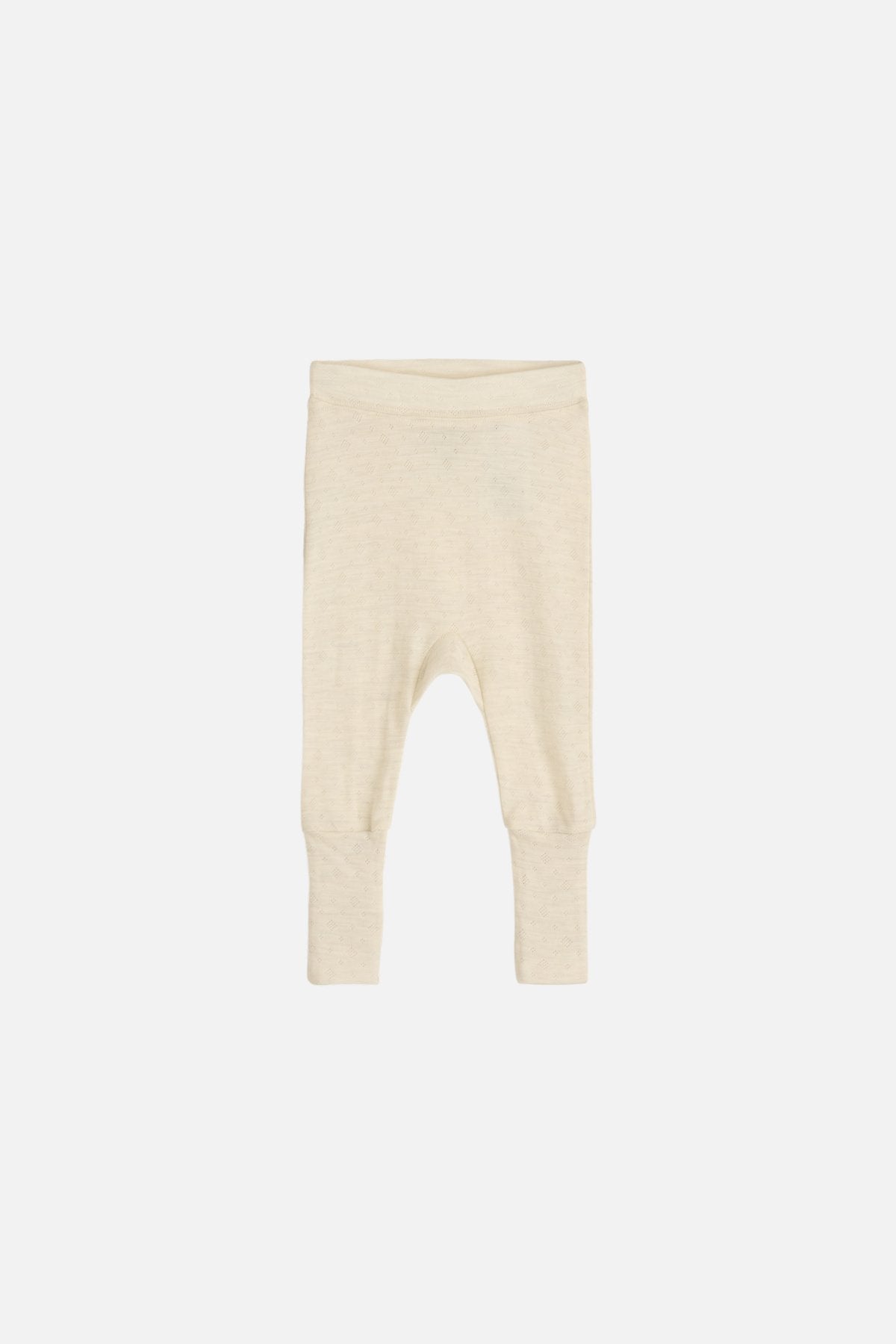 Hose aus Wolle/Seide von der dänischen Marke Hust and Claire. Die Hose hat einen luftigen Schnitt und elastische Bündchen. Die Füsse können bis zur Grösse 86 umgeklappt werden. Das Material gleicht die Körpertemperatur sehr gut aus. Mit einem Pointelle-Muster (die Hose hat im Material Löchli als Muster).