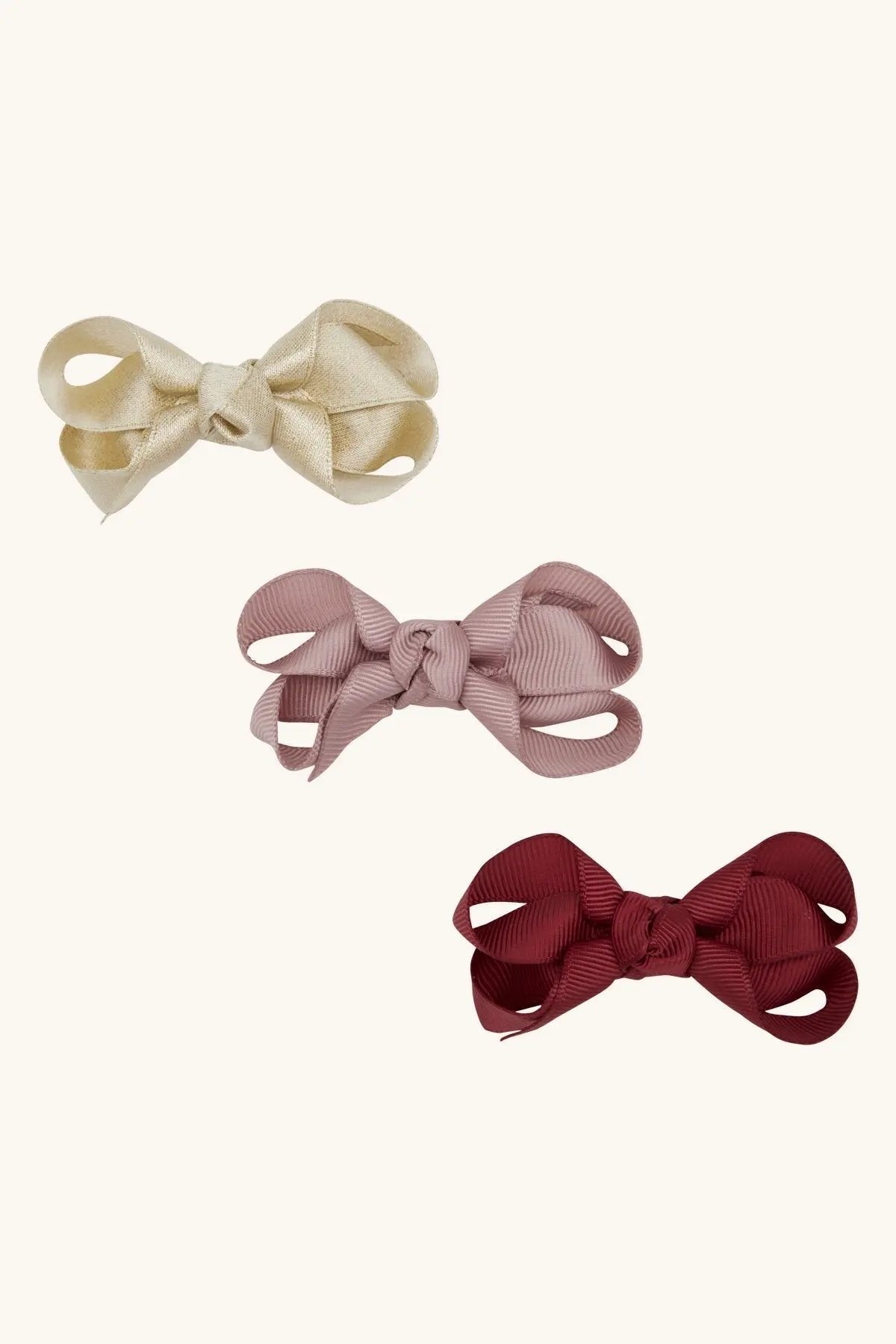 Festliche Haarspangen Faneth im 3er Set. Die Schleifen in drei verschiedenen Farben sind auf eine Spange angebracht. Der leicht glänzende Stoff setzt schöne Akzente im Haar. Von der dänischen Marke Hust and Claire.