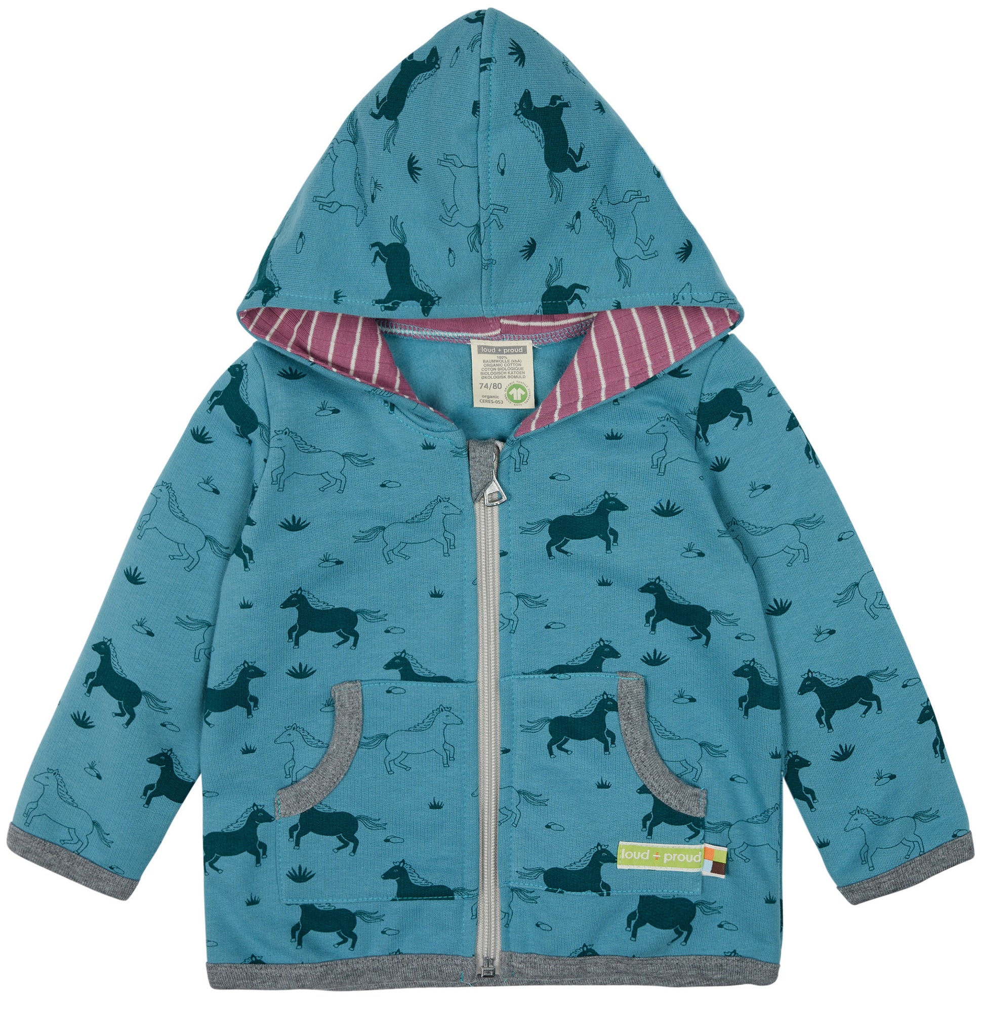 Jacke bedruckt mit Pferden. Aus hochwertiger GOTS zertifizierter Biobaumwolle. Die Kapuze ist innen mit gestreiftem Jersey abgefüttert. Vorne mit kontrastfarbigem Reißverschluss. Mit praktischen Kängurutaschen mit kontrastfarbigen Paspeln am Eingriff. Für drunter oder einfach so. Logo-Etikett mit Fähnchen an der Tasche. Aus fairer und nachhaltiger Herstellung in Ungarn. Von der deutschen Marke Loud and Proud.
