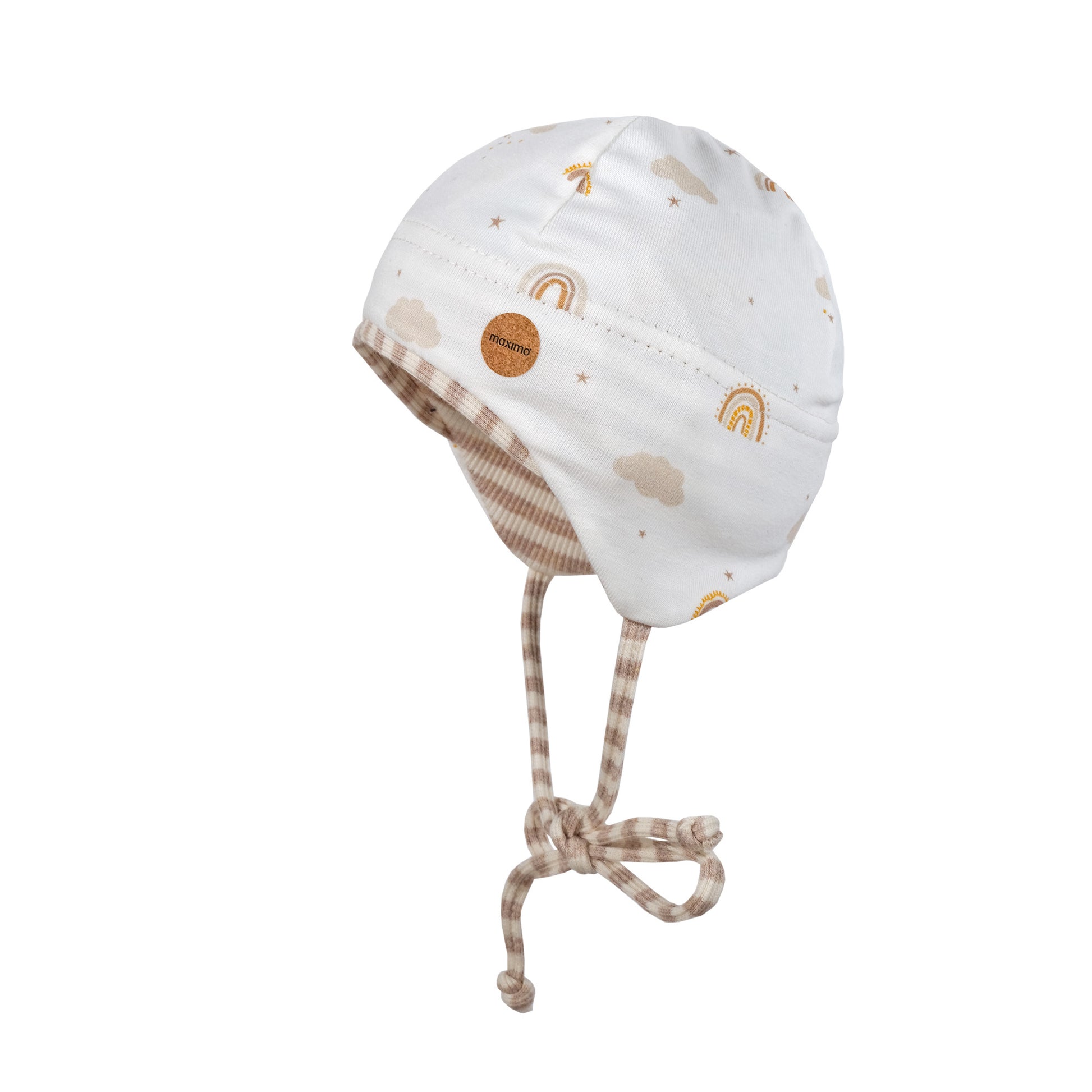 Süsses Newborn-Mützchen aus GOTS zertifizierter Biobaumwolle. Der Kopfbereich ist aus ganz leichtem Jerseystoff. Der innere Rand, also Stirn-, Ohren- und Nackenbereich ist zusätzlich mit geringeltem Jerseystoff abgefüttert. Praktisch für die milde Übergangszeit und kühle Sommerabende. Mit Bindeband für einen guten Halt. Die Ohrenklappen schützen das Baby wunderbar. Der Jersey ist schön dehnbar. Die Mütze ist unisex.