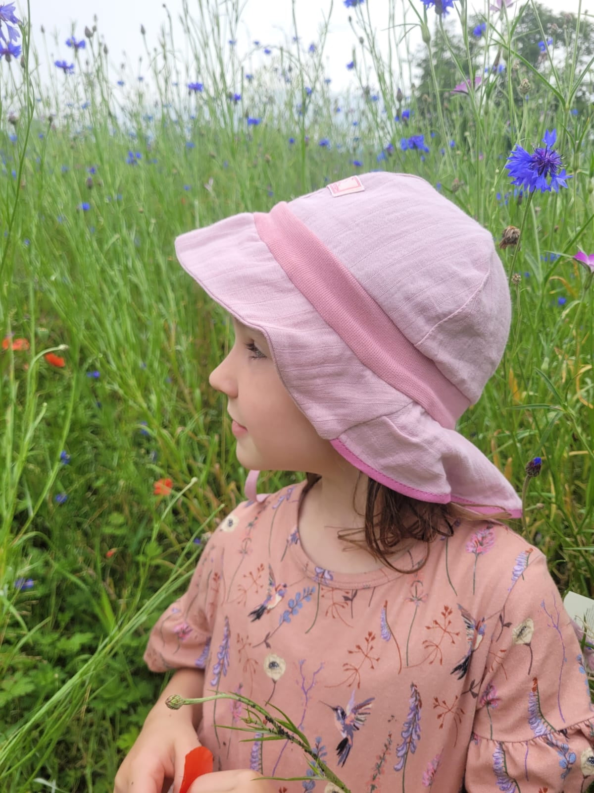Dieser Sonnenhut mit dem Namen "Feuerwehr" von Pickapooh aus fein gewebter Bio-Baumwoll-Musselin (kbA) ist ein beliebter Klassiker. Die breite Krempe schützt Gesicht, Nacken und Ohren vor der Sonne. Mit Bändern an den Seiten lässt er sich am Kinn zusammen schnüren. Der Strickbund in der Kopfmitte ist dehnbar. Dadurch wächst der Hut lange mit. Das hautfreundliche und atmungsative Material verhindert ein Schwitzen unter der Mütze an warmen Tagen.