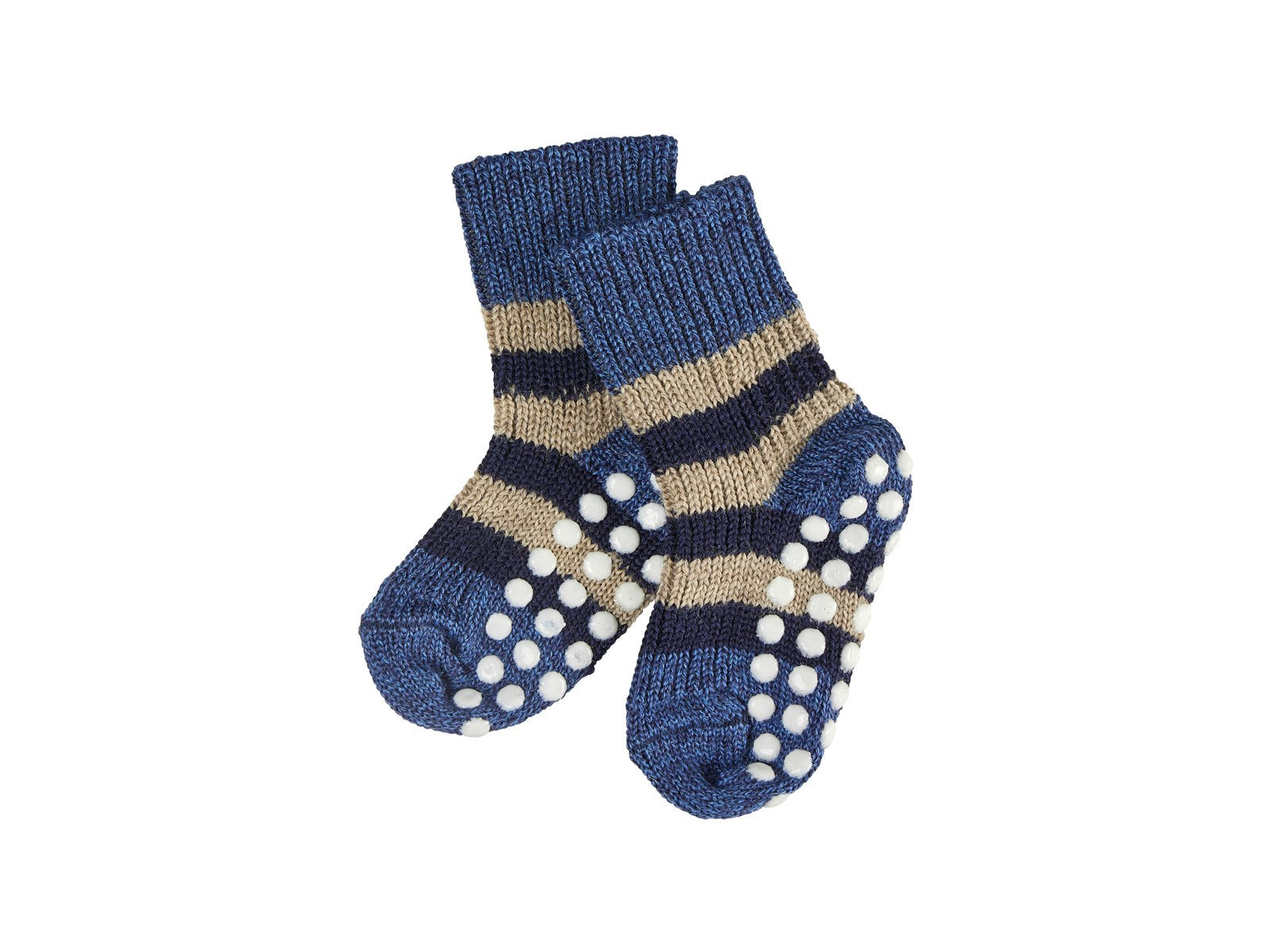 Warme Ringelsocke aus dicker Bio Schurwolle. Mit Stoppern an der Fusssohle, damit dein Kind nicht rutscht. Ohne PVC, Plastisole und Phtalate. Das Naturmaterial ist regulierend. Handumkettelte Fussspitzen vermeiden Druckstellen der Wollsocken.