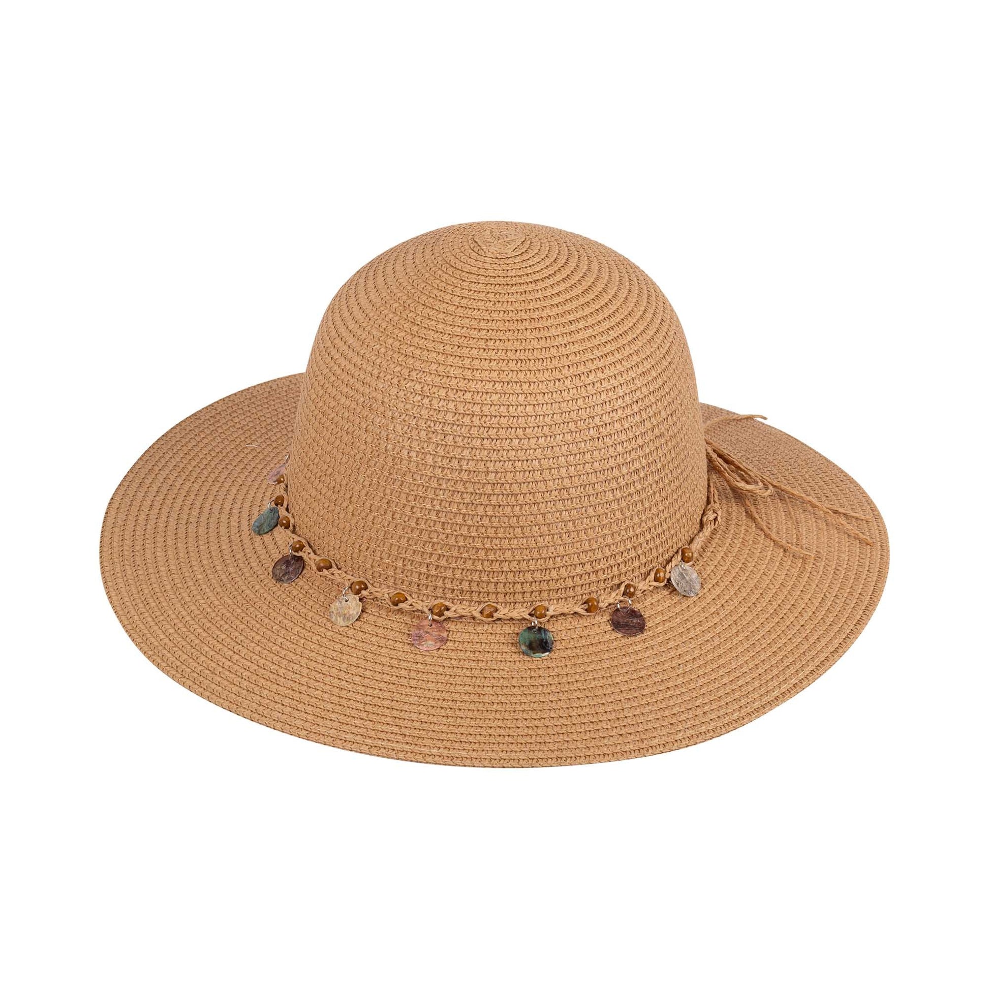 Eleganter Damen-Sonnenhut aus geflochtenem Papier. Durch die extra breite Krempe schützt der Sommerhut optimal vor der Sonne und macht jedes Outfit zu etwas ganz Besonderem. Mit geflochtenem Kordelband und Perlmuttschmuck daran hängend.