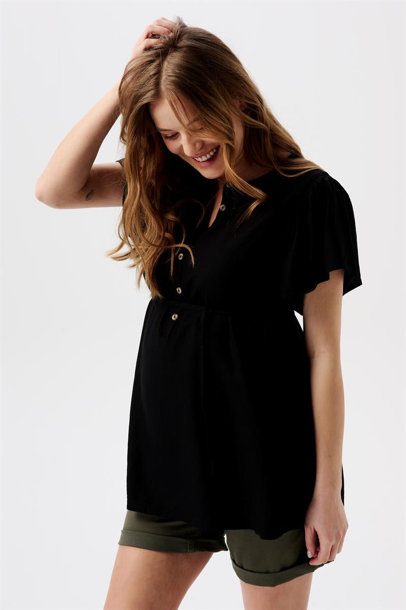 Luftige Sommerbluse aus dem tollen Materialmix Viskose/Leinen. Pferfekt für die heissen Tage. Kann in der Schwangerschaft wie auch danach zum Stillen getragen werden. Zum Stillen öffnest du einfach die Knöfpe. Mit Bindeband. Von der Marke Noppies.