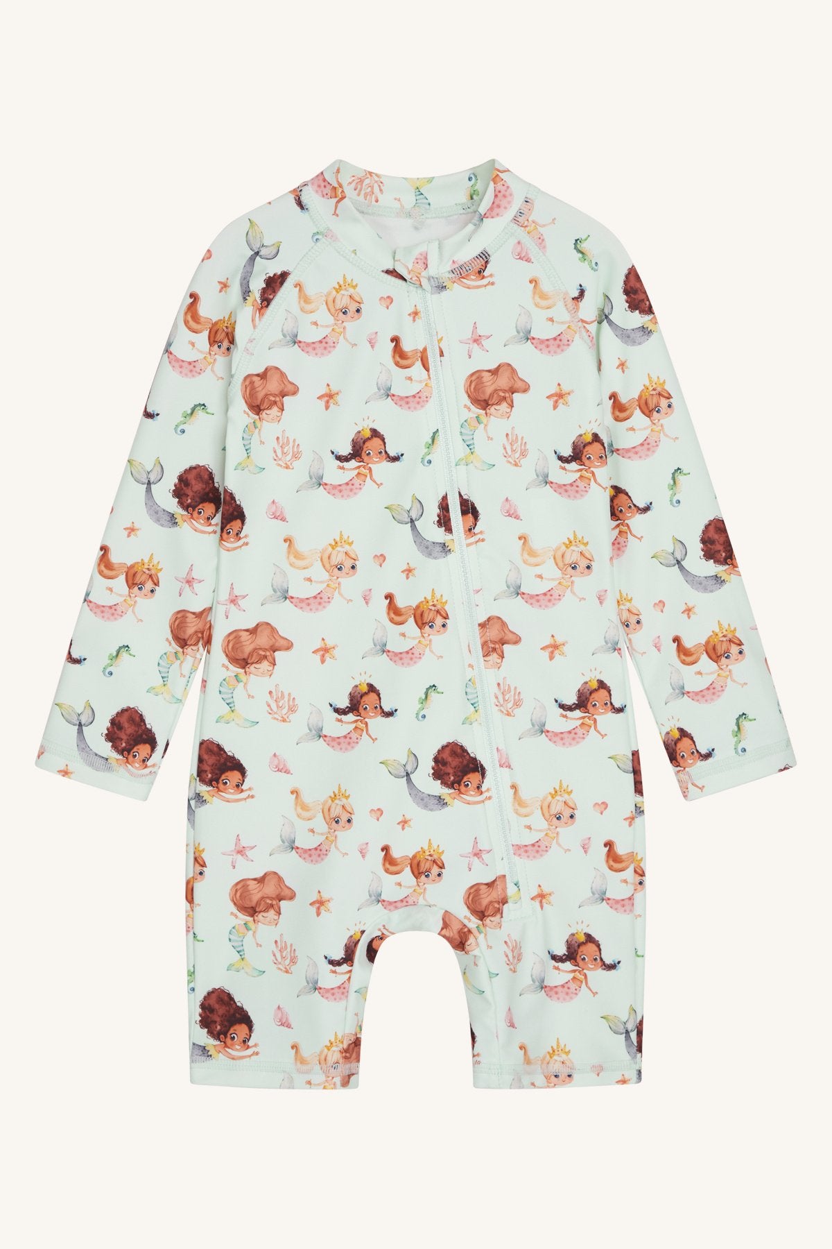 UV-Badeanzug mit schräg verlaufendem Reissverschluss und langen Ärmeln. Schützt die Kinderhaut vor der Sonne mit einem UV50+ Schutz. Mit Meerjungfrauen bedruckt. Aus recyceltem Polyester. Auf Schadstoffe geprüft.