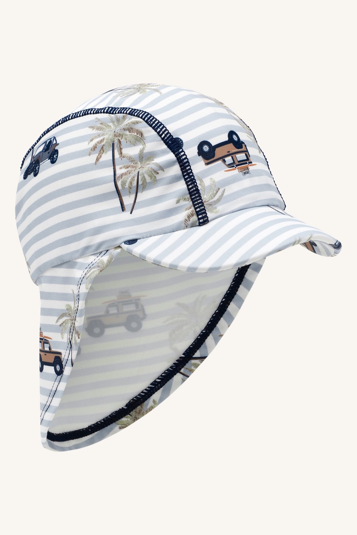 Gestreifte Bademütze mit Autos und Palmen bedruckt. Verfügt über einen Schirm und Nackenschutz. Die Mütze hat einen UV50+/UPF50-Filter. Dieses Produkt besteht zu 83 % aus recyceltem Polyester. Von der Marke Hust and Claire.