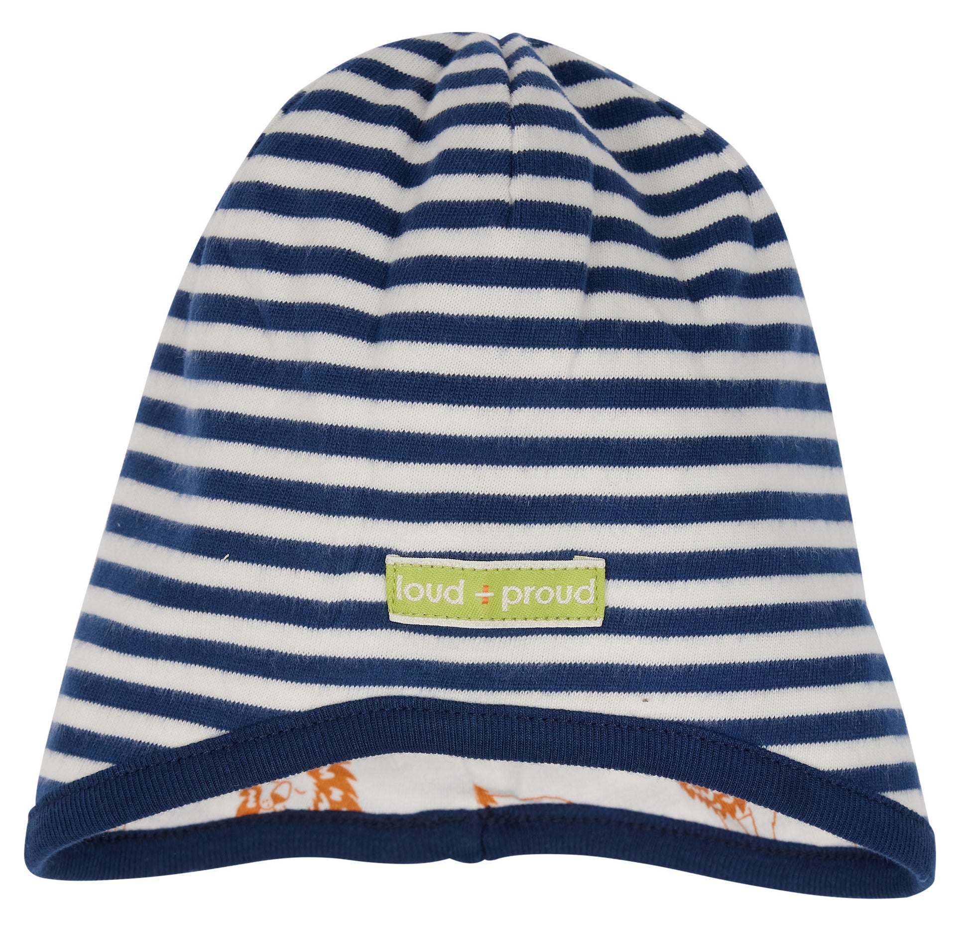 Coole Mütze aus GOTS zertifizierter Biobaumwolle. Die Mütze ist wendbar. Auf der einen Seite ist sie mit Löwen bedruckt, auf der anderen Seite geringelt. Die Kante ist kontrastfarbig eingefasst. Vorne Logo-Etikett. Nachhaltig, ökologisch und fair in Europa hergestellt. Von der deutschen Marke Loud and Proud.