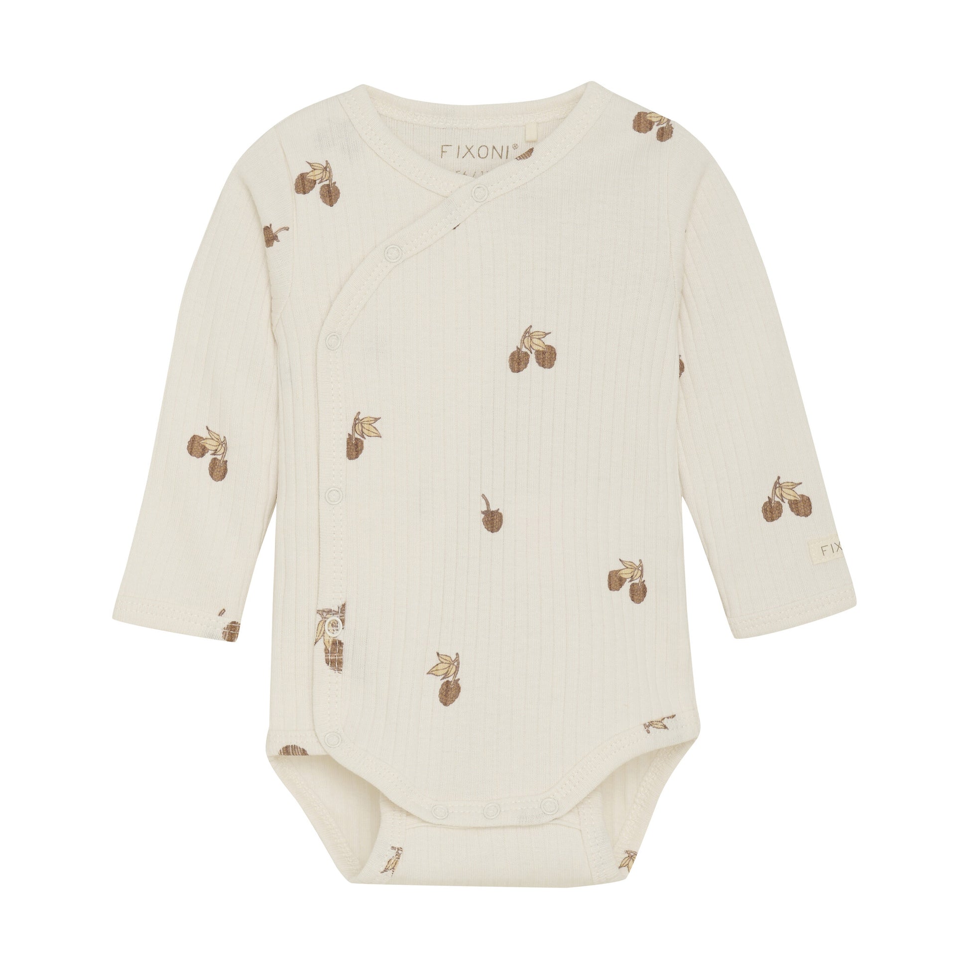 Body cache-cœur à manches longues en coton biologique certifié GOTS. Ce body se ferme haut pour protéger également la zone du cou. Il présente une structure côtelée et est imprimé de motifs de mûres. Les bords sont ondulés pour un détail particulier.
